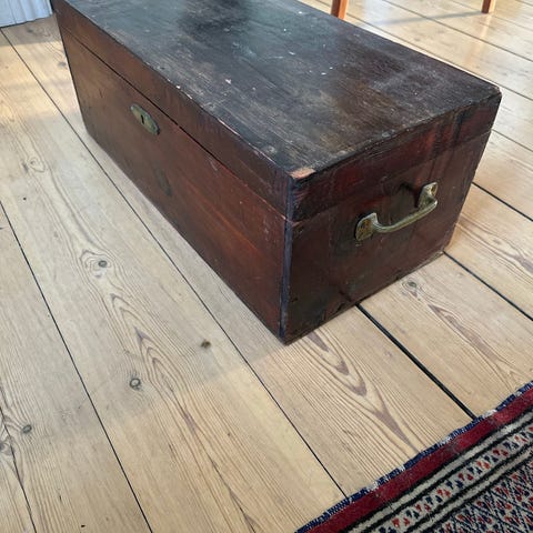 Standkiste antik, fra 1770, originale farver, ommalet af proffesionel maler i 1977, stået på Fyns herregård. Meget fin stand, buet låg, smedejerns håndtag i begge ender. H 58, B 60, L 130 cm. Skal afhentes, giv et bud. Efter evt aftale kan den leveres mod betaling