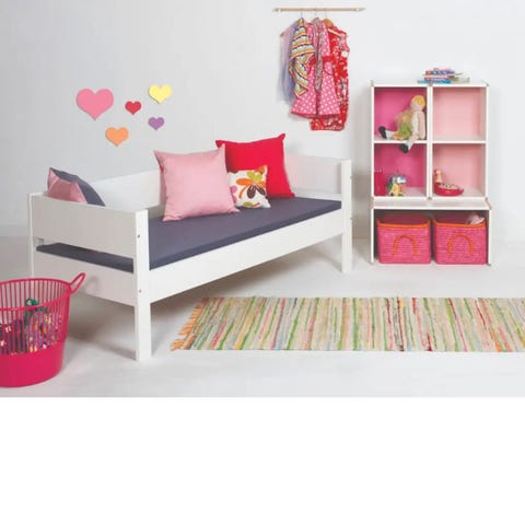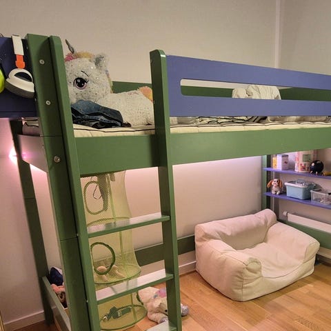 Juniorseng fra mærket Manis-h (IKKe Ikea men jeg kunne ikke finde korrekt mærke på listen) som kan hæves (som på billederne) men også sættes ned. Den er brugt til to børn og har derfor nogle mærker i træet men den fungerer super fint stadig. Stigen har dog en revne og er pyntet med klistermærker men de kan fjernes😅 madras kan medfølge
