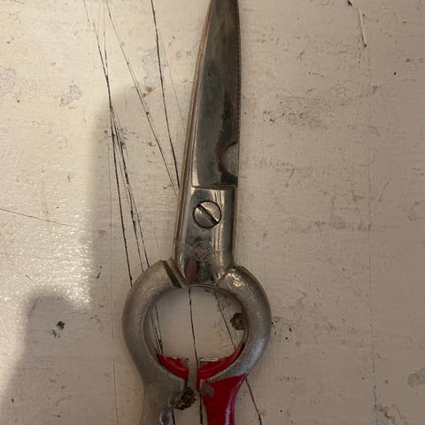 Metal saks med en længde på 25 cm og en bredde på 8 cm. Saksen har et sort og rødt gummieret håndtag for bedre greb og komfort under brug. Bladen er robust og egnet til at klippe gennem metal og andre hårde materialer. Denne type saks bruges ofte i håndværk og til DIY-projekter. Fremstillet af stål for holdbarhed og lang levetid. Tags: metal, saks, håndværk, DIY