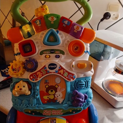 VTech gåvogn med aktivitetslegetøj. Forsiden har trykknapper formet som figurer og tal, drejehjul, lille dør med ko-figur, telefonrør samt klaverknapper med toner og farver. Gåvognen er egnet til små børn, der øver sig i at gå, og kan bruges til leg med lyd, lys, former, farver og tal. Fremstillet i plast med håndtag øverst til at skubbe vognen.