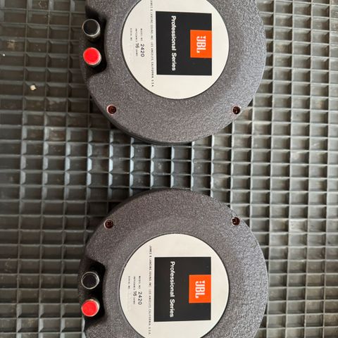 Hermed sælger jeg 2 flotte JBL 2420 horn drivere, med tilhørende 2307 horn og intakte og pæne JBL L91 spredelinser. De fremstår pæne og har været anvendt i mine JBL 4343 højtalere.