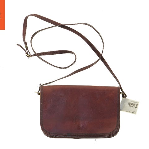 Tasken er en skuldertaske i læder med et unikt patchwork-design på forsiden, hvor der ses forskellige farvede og mønstrede kvadrater, inklusive blomstermotiver. Tasken har en justerbar skulderrem og en lynlåslomme på bagsiden for ekstra opbevaring. Der er synlige sømme, der skaber et karakteristisk mønster på taskens læder. Størrelse: 29x20 cm. Tasken e fin og velholdt.