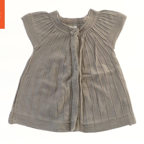 En børne cardigan i lys cremefarve med korte ærmer og knapper. Cardiganen har et dekoreret område på forsiden med et pink og blå design, som ligner et lille ansigt. Den er designet i et mønstret strikmønster, hvilket giver den et elegant udseende. Cardiganen er lukket med to små, ensfarvede knapper, og måler 43x37 cm.