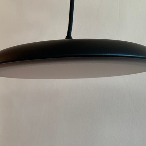 Dette er en sort pendellampe med et moderne design i opalglas.