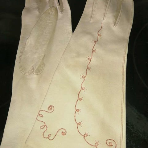 Denne par handsker er lavet af lyse læder og har en længde på 23 cm. Designet inkluderer en struktureret stofdetalje, der løber over fingrene og håndfladen på hver handske. Handskerne har et klassisk og enkelt design, der giver et tidløst look.