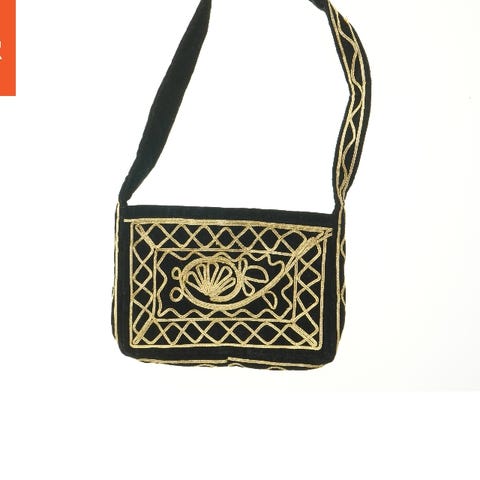 Denne broderede håndtaske er fremstillet i stof med et farverigt geometrisk mønster i orange, rødt og gule nuancer. Den er udstyret med en gylden metalramme og en kæde til bæreevne. Vesken lukkes med en kuglelukning på toppen. Størrelsen er 18x16 cm, hvilket gør den praktisk til små nødvendigheder. En tilhørende metallisk spejl er også inkluderet. ny