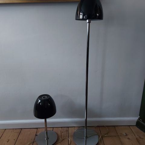 Sæt af tre cylindriske lamper, der hver har en hvid base med sorte linjer som dekoration. De er forskellige i højde og er forsynet med en strømkabel med tænd/sluk-knap. Disse lamper er ideelle til brug som dekorative lys eller bordlamper.