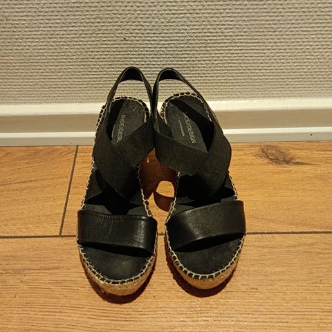 Et par sorte damesandaler med en størrelse på 41. Sandalerne har en bred rem over foden og en komfortabel sål. Der er et designmønster på remmen, der giver et moderne udtryk.