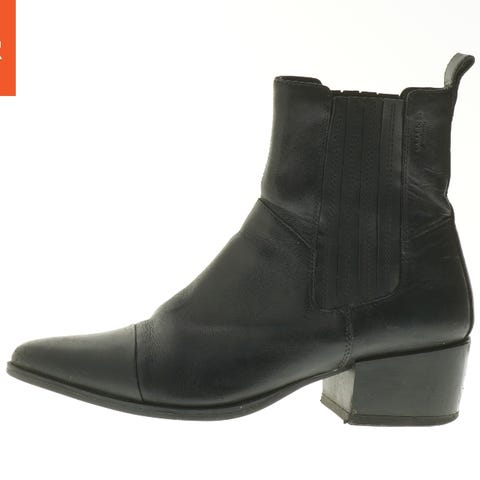 Ankelstøvlerne er fremstillet af sort læder, har elastikindsats på siderne for nem påklædning og slidstærke gummiydersåler. Hælhøjden er moderat, og de har en afrundet tåform. I god stand uden synligt slid.