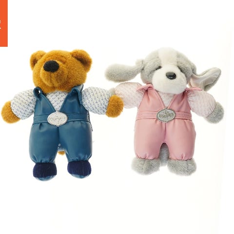 Blå tøjdyr formet som en hund. Lavet af denim stof med et hvidt bælte rundt om maven og knapper som øjne. Der er ingen synlige tegn på slid eller skader.