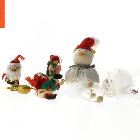 En samling af julepynt, herunder julekugler, girlander, og andre dekorative elementer. De fleste elementer er i traditionelle julefarver såsom rød og grøn, samt metalliske toner. Sættet inkluderer også en bog med titlen 'Angels from The Louvre' og en pakke med røde lys. Alt leveres i en mørkeblå opbevaringsboks mærket 'BUBETTI FIRENZE'.