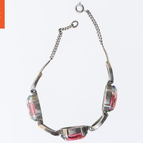 Et solidt, sølvfarvet armbånd med en klart defineret form og en synlig hængselmekanisme. Armbåndet har en skinnende overflade, men nogle ridser og brugsspor er synlige, hvilket tyder på, at det er blevet brugt.