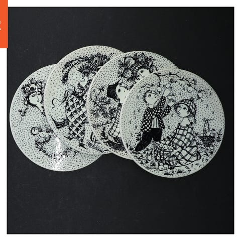 Sæt af seks udsmykkede porcelænstallerkener med sort/hvid illustrationer af figurer og motiver, fremstillet af Bjørn Wiinblad. Hver tallerken er dekoreret med unikke kunstværker, signeret af kunstneren. Tallerkenerne kommer fra serien 'Nocturne' af Bjørn Wiinblad, fremstillet af Nymølle Denmark.