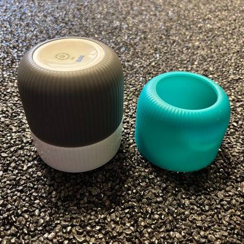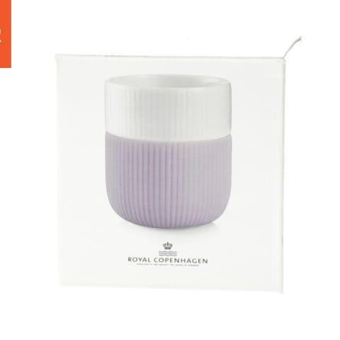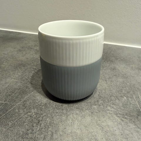 Krus fra Royal Copenhagen i serien Fluted Contrast. Kruset har en grå farve med karakteristisk rifling og en blå silikonebund for ekstra greb og beskyttelse mod varme. Original emballage medfølger.