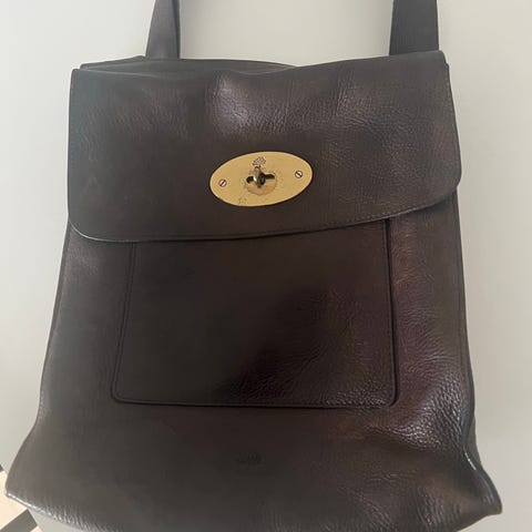 Sjældent udbudt og velholdt Mulberry kontormappe i sort 'krokodille'-læder. Nogle brugsspor, men ellers i rigtig god stand. Tre indvendige rum med et stort midterrum og to mindre rum på hver sin side. Tasken er fremstillet i læder med præget mønster og har metalbeslag i en gylden tone. Indvendigt er tasken foret med stof med Mulberry-logo. Velegnet som hverdagstaske eller arbejdstaske.