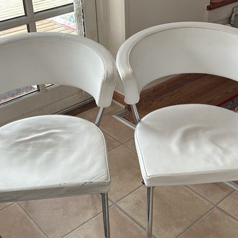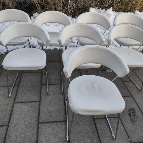 Jeg sælger 10 stk hvide stole i ægte læder med virkelig god siddekomfort. De har patina og er alle hele og fine.