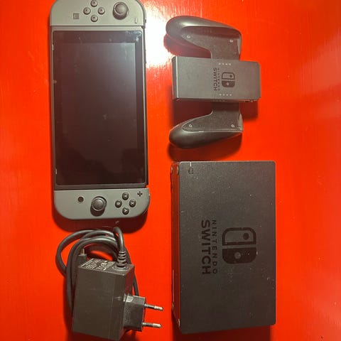 Nintendo Switch konsol med aftagelige Joy-Con controllere og dock i sort. Konsollen kan bruges både som håndholdt enhed og til spil på tv via docken. Sættet på billederne omfatter konsol med skærm, to Joy-Con controllere, Joy-Con holder samt strømforsyning og HDMI-/tilslutningskabel efter hvad der ses på billederne. Velegnet til Nintendo Switch spil og lokal eller online multiplayer afhængigt af spil og opsætning.