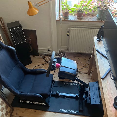 Egnet til brug som racing simulator til spil og træning, hvor der ønskes en fast opstilling med rat, pedaler og skærm samlet ét sted.