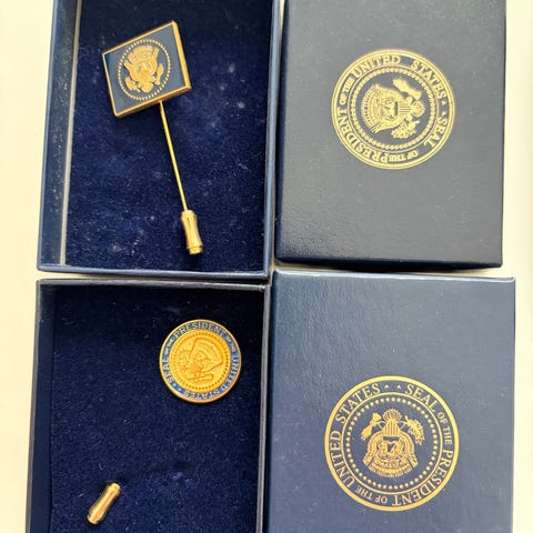 Sæt med fem vintage sovjetiske nåle og pins i metal med emalje. Motiverne omfatter blandt andet rød sløjfe med portrætmedaljon, skjold med ryttermotiv, kvadratisk nål med stjerne og bynavn samt rektangulær nål med rytter og bymotiv. Farverne er primært rød, sølvfarvet, guldtonet og blå. Velegnet som samlerobjekter eller til dekoration på tøj, tasker eller opslagstavle.