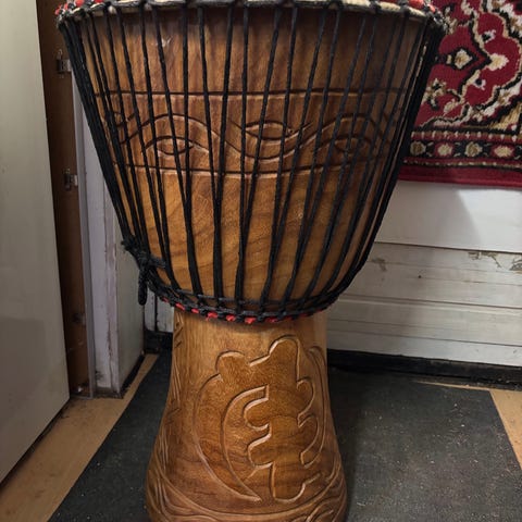 Djembe. Tweneboatræ med gedeskind. Fra Ghana. Lavet Bass (percusionist fra Ghana). Trommen har traditionel snorstramning langs siderne og en konisk fod. Velegnet som percussioninstrument til rytmeøvelser, sammenspil og dekoration i musikrum eller stue.