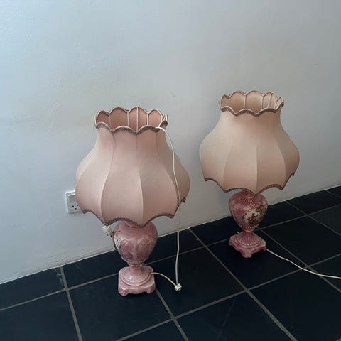 Ældre lertøjslampe i orange og brune nuancer og med en kunstnerisk nubret udforming sælges