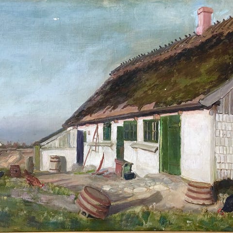Hans Kristiansen ( 1888 - 1958 ) indrammet tegning/ tusch af gademotiv, nyboder fra 1931. Motivet viser gaden med huse, tage med skorstene og en gadelampe i forgrunden. Tegningen er udført i dæmpede nuancer med fokus på arkitektur og gademiljø. Værket er signeret og dateret 1931 i nederste højre hjørne. Billedet er monteret i rektangulær ramme med kantdekoration og ophæng på bagsiden, klar til at blive hængt op på væggen.