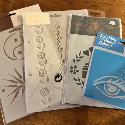 tegneskabeloner til børn. Sættet består af to plastskabeloner med forskellige motiver. Den ene skabelon har dinosaurmotiver og cirkelformede udskæringer, den anden har bogstaver, tal og forskellige figurer. Skabelonerne kan bruges til at tegne konturer, øve bogstaver og tal samt lave gentagne mønstre på papir. Velegnet til kreativ leg og tegneaktiviteter for børn.