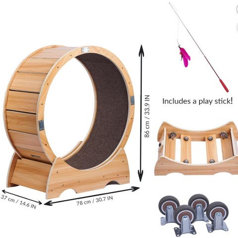 Katte løbehjul aktivitetslegetøj i stor størrelse i rød og sort. Hjulet er monteret på en stabil base, så katten kan løbe og bevæge sig indendørs. Egnet til huskatte, der har brug for ekstra motion og aktivering i hjemmet. Overfladen indvendigt i hjulet er beklædt, så katten står fast under brug. Kan placeres i stue, gang eller andet rum med god gulvplads.
