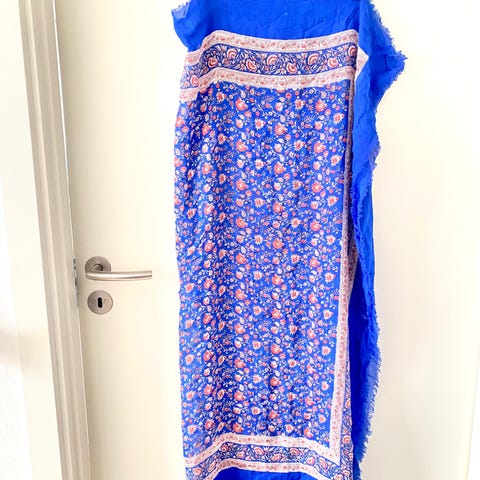 Sælger dette unikke og utroligt smukke sjal i en strålende blå farve med detaljeret håndbroderi. Sjalet er oprindeligt et stort broderet uldtørklæde, som er nænsomt syet om til et sjal. Det har et fantastisk fald og kan bruges både som en elegant wrap eller et lunt tørklæde.