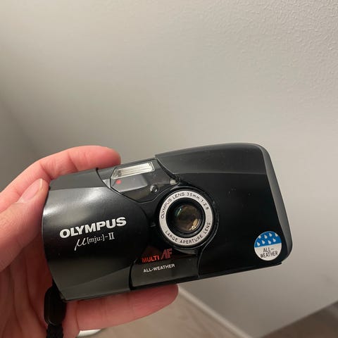 Olympus µ[mju:]-II Zoom 80 kompaktkamera i sort. Analogt 35 mm point-and-shoot kamera med indbygget zoomobjektiv og automatisk blitz. Kameraet har indbygget søger, LCD-display på toppen til indstillinger samt håndledsrem. Velegnet til brug med 35mm
