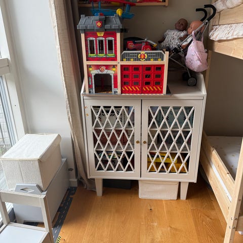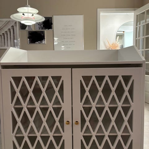 Cam Cam Copenhagen skab til børneværelse i hvid. Skabet har to låger med gittermønster og lille greb på midten. Det står på fire ben og har en forhøjet kant på toppen, som hjælper med at holde ting på plads. Velegnet til opbevaring på børneværelset, f.eks. tøj, legetøj eller udstyr.