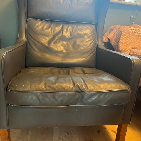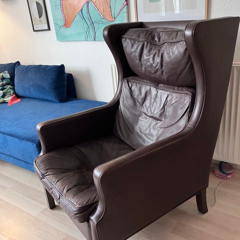 Øreklap lænestol fra Stouby i brun kernelæder. I god stand men med brugsspor.