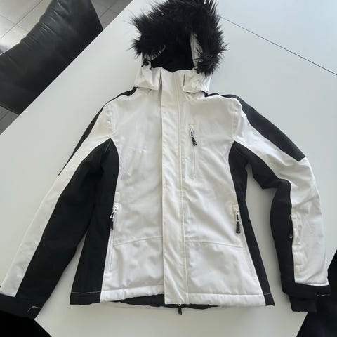I god stand, kun brugt to gange på ski. Vindtæt og vandtæt. Ingen huller eller slid. Men der er dog to pletter foran jakken nederst på det hvide stof.