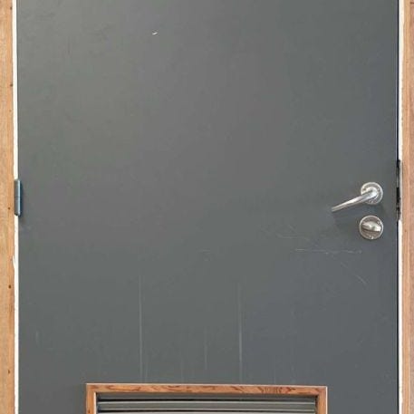 Indvendige trædøre (massive). Dørene har monterede hængsler og dørgreb med nøglehul. Egnet som indvendige døre i bolig eller lignende, hvor der ønskes klassiske fyldningsløse trædøre. Flere ens døre på billederne, som kan anvendes samlet eller enkeltvis afhængigt af behov og mål hos køber.