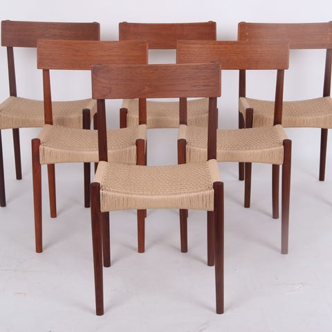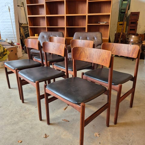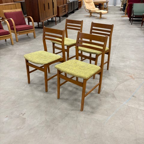 6 fede retro spisebordsstol i teak/bøg. Trænger til nyt stof men ellers fin stand.