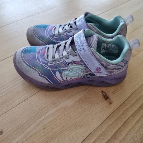 Skechers Star Collection børnesko i størrelse 22 til piger. Skoene har et mønster med stjerner i lyserøde og lilla nuancer. Materialet er tekstil med syntetiske detaljer. Skoene har lukkesystem med velcro samt lys i sålen. Nemme at få på og af.