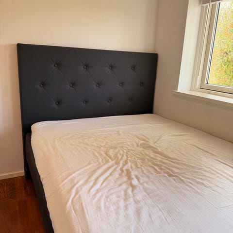 Jensen sengegavl i polstret tekstil i mørk blå farve. Rektangulær model med afrundede hjørner og knapdetaljer på fronten. Bagsiden er glat og beregnet til montering op mod væggen bag sengen. Velegnet som ryglæn og afslutning på seng i tilsvarende bredde som gavlen.