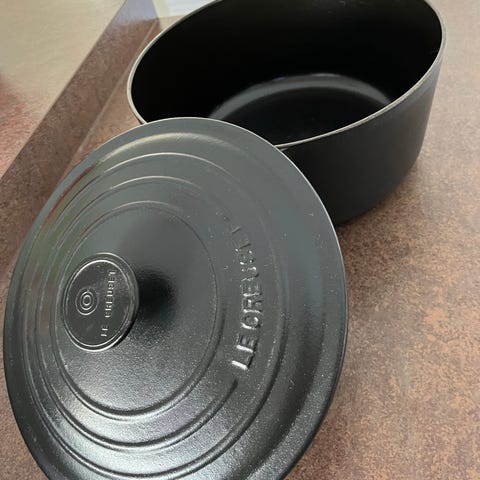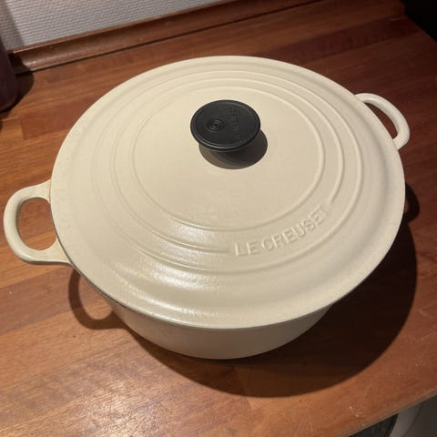 3 stk. Le Creuset gryde- og sautépandesæt i støbejern i cremefarve. Sættet består af tre dele: to runde gryder med låg og en sautépande med låg og lang håndtag. Indersiden er lys emalje, ydersiden er cremefarvet emalje med sorte knopper på lågene. Velegnet til madlavning på komfur og i ovn afhængigt af komfurtype og producentens anvisninger. Sættet kan bruges til fx simreretter, gryderetter og stegning, hvor støbejernets varmefordeling udnyttes.
