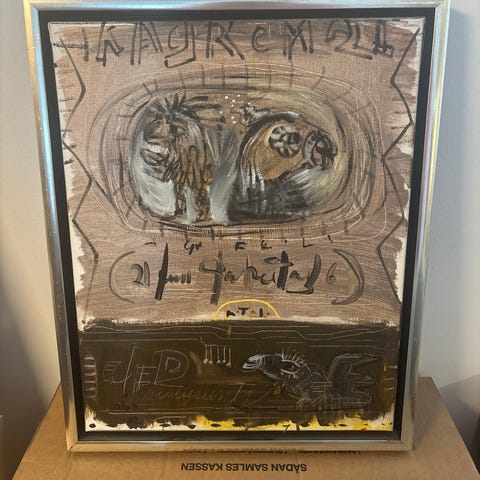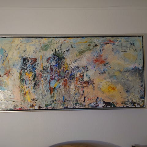 Meget fint og spændende maleri i flotte farver. Med pæn og velholdt ramme. Lavet af kunsteren OLOX ( Ole Daniel Kristensen ) en ægte original kunstner fra Odsherred - Nakke. Fra 2003