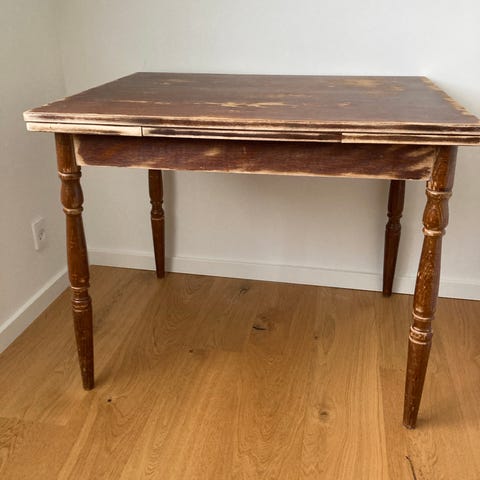 Praktisk lille spisebord / skrivebord som måler 68 i bredde og 109 i længen. Kan slås ud med hollandsk udtræk i hver ende så bordet bliver 164 i længden. Det er med Chrome ben og grå meleret bordplade.