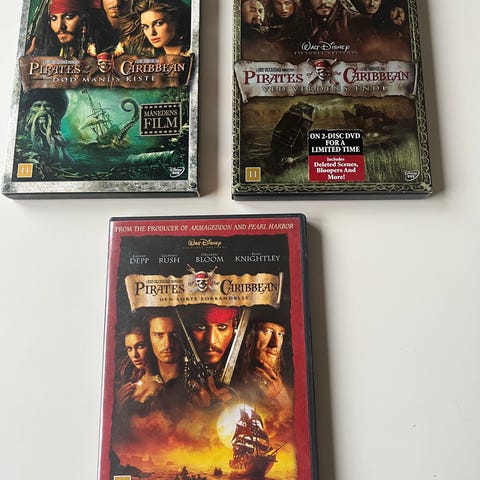 Disney Pirates of the Caribbean dvd. Filmcover med motiver fra Pirates of the Caribbean-serien. Velegnet til afspilning på dvd-afspillere, der understøtter standard dvd-format.
