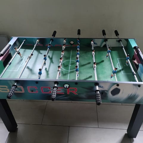 Bordfodboldbord med grøn spilleflade og sorte kanter. Bordet står på et fast stel og kan vippes op i lodret position for pladsbesparelse. Spillerne er monteret på metalstænger med sorte håndtag, og der er mål og tællere i hver ende. Egnet til indendørs brug i hjem, fritidsrum eller lignende miljøer.