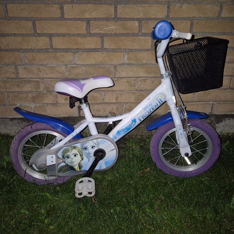 Disney Frozen børnecykel med 12 tommer hjul i hvid og lilla farve. Cyklen er dekoreret med motiver fra Frozen og har støttehjul. Designet til børn med justerbart sæde og styr.