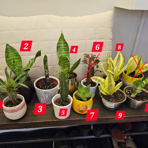 Partiet omfatter flere forskellige typer stueplanter i forskellige størrelser, alle plantet i plastpotter.