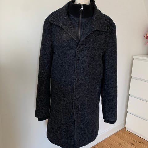 Uldfrakke til dame i sort, str. S. Frakken har dobbeltknaplukning foran, høj krave og sidelommer. Bagpå er der dekorativ knapdetalje i taljen. Fremstillet i uldmateriale, velegnet som overtøj i de køligere måneder.