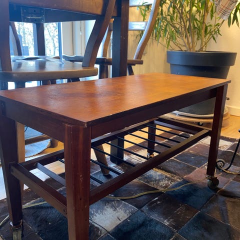 Flot vintage teaktræs bord med hjul. Nogle mærker i bordpladen. En halv fyldt teaktræsolie følger med.