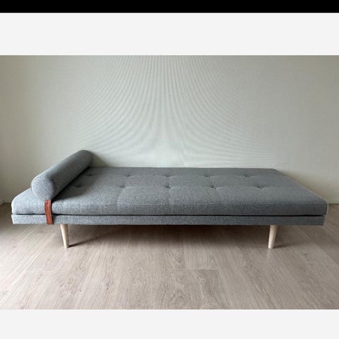 Daybed fra Innovation Living i gråt tekstilbetræk (aldrig brugt). Polstret liggeflade med knap-quiltning og cylinderformet nakkepude i samme stof. Monteret på ben i lyst træ, som giver god frihøjde under møblet. Velegnet som ligge- eller hvileplads i stue, gæsteværelse eller kontor. Materiale: tekstilbetrukket polstring og træben. Farve: grå med meleret struktur.