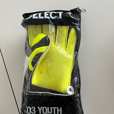 Select målmandshandsker i grøn med sort og hvid. Handskerne har justerbar velcrolukning ved håndleddet og polstret overhånd. Størrelse 6 børn omkring 8-10 år.