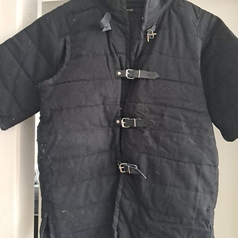 Epic Armoury unisex kappe, læderbrystplade og lang tunika. Kappen er i en brunlig/karamel farve og mærket i størrelse 6-8Y. Brystpladen er i mørk læder med justerbare remme i siderne og over skuldrene. Tunika sort elver, økse og sværd.