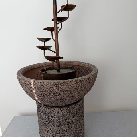 Produktet er en rund vandfontæne med en struktureret overflade. Den er lavet af et letgrå plastmateriale, der efterligner sten. Fontænen har en cirkulær form med en udskæring til vandstrømmen ovenpå. Sort ledning er synlig.